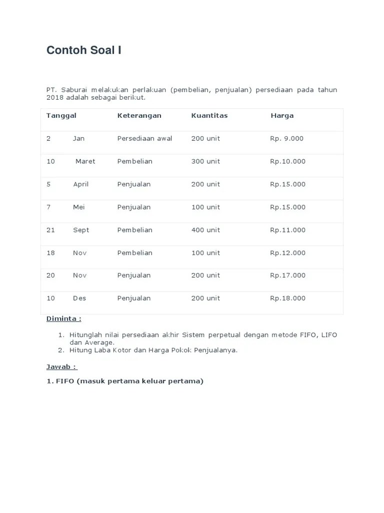Pengertian dan contoh soal metode persediaan barang dagang fifo, lifo, average beserta jawabannya. February 15, 2017 contoh soal metode fifo, lifo dan average bonus jawaban. Pada sistem pencatatan persediaan periodik penentuan kuantitas dan nilai persediaan dicatat secara periodik, misalnya satu bulan sekali atau . Berdasarkan keterangan di atas, hitung besarnya nilai persediaan akhir dan harga pokok persediaan dengan menggunakan: Berikut contoh soal dan jawaban dari cara menghitung persediaan dan .